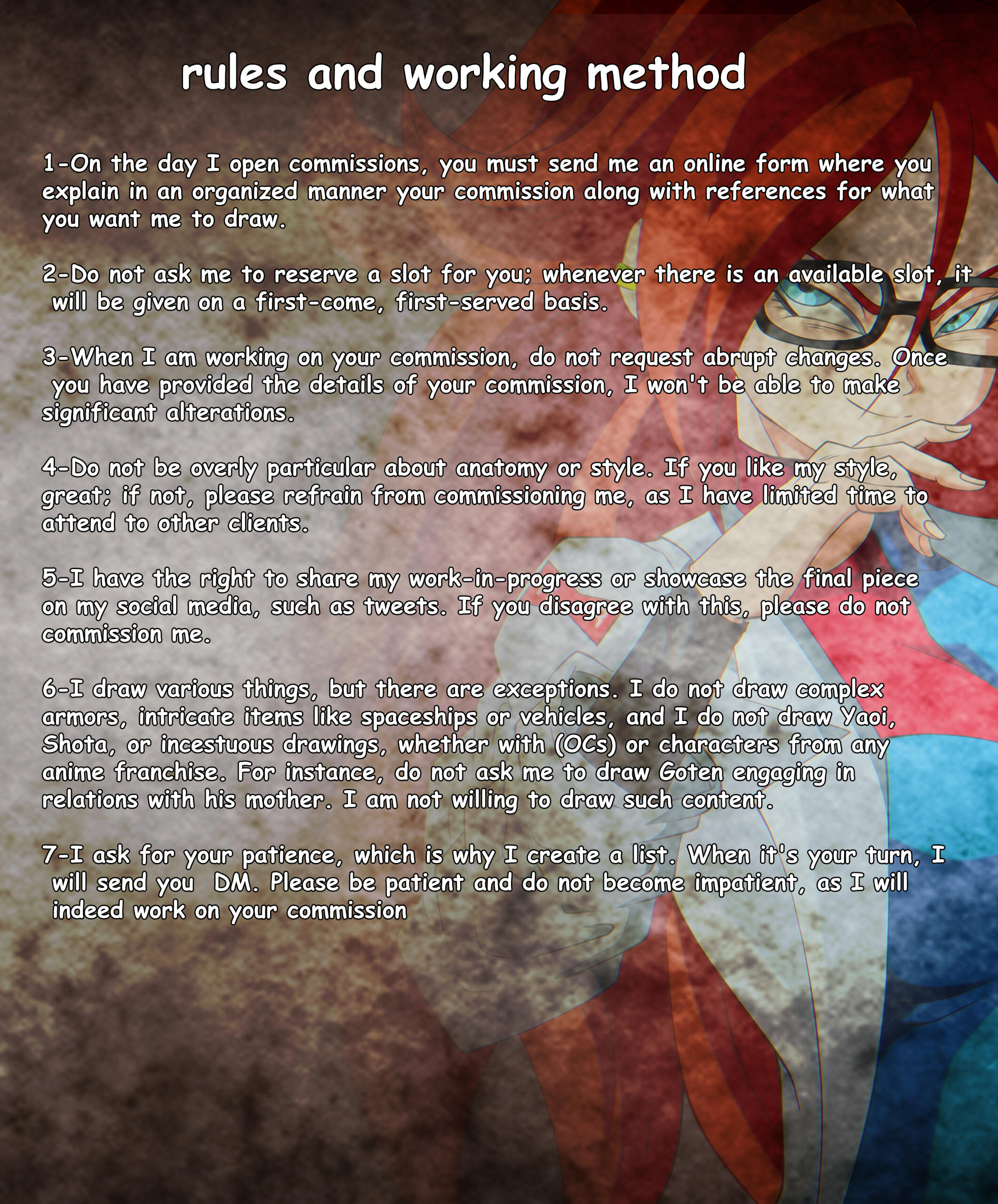 1-New Customer Discount: If you're a new customer, you'll get a 20% discount. Additionally, if you purchase two commissions on your first order, the second commission will have a 40% discount as a welcome gift.2-Collaborations with My OCs: If you'd like to include my OCs in your drawing, all of them have a 20% discount. However, these will only be crossovers—non-canon interactions or balanced battles, nothing official.3-Loyalty Discount: If you've purchased more than five commissions since you started commissioning me, you'll receive a permanent 10% discount on the total cost of your future commissions.4-OCs of My Custom Races: If you want an OC of my created races, whether Blanerian or Draconian, you'll need to send me a DM in advance so I can approve your OC. It must adhere to the lore and abilities of the Blanerians and Draconians.